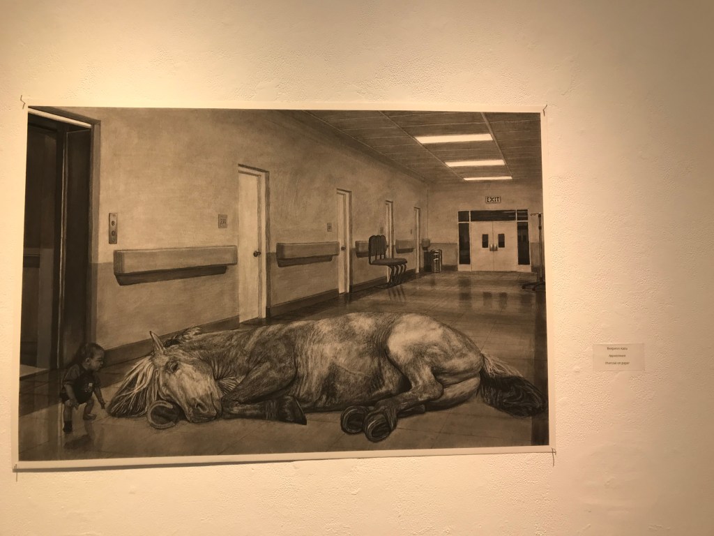 When looking at his pieces, Kaita only used charcoal and paper. I asked why, and his simple answer is that he was exploring what he can do with charcoal and paper. On each piece, he spent about one month starting and finishing. He told me that right before the deadline for the gallery, he finished his last piece. I noticed that in each piece, he mentions a horse or draws a horse. I asked why horses, and he responded that he was playing around with the idea of horses and he stuck with it for all these pieces.