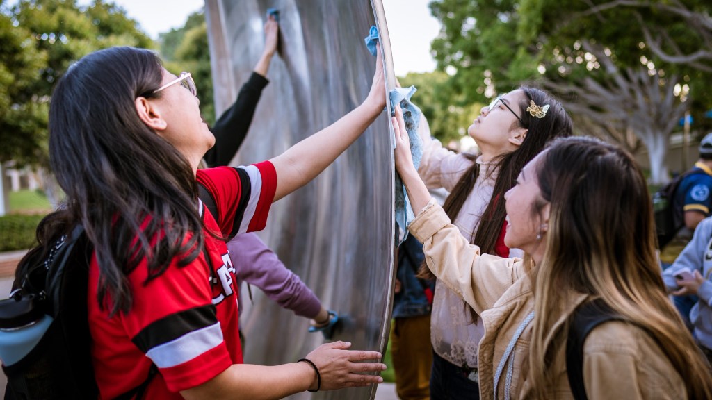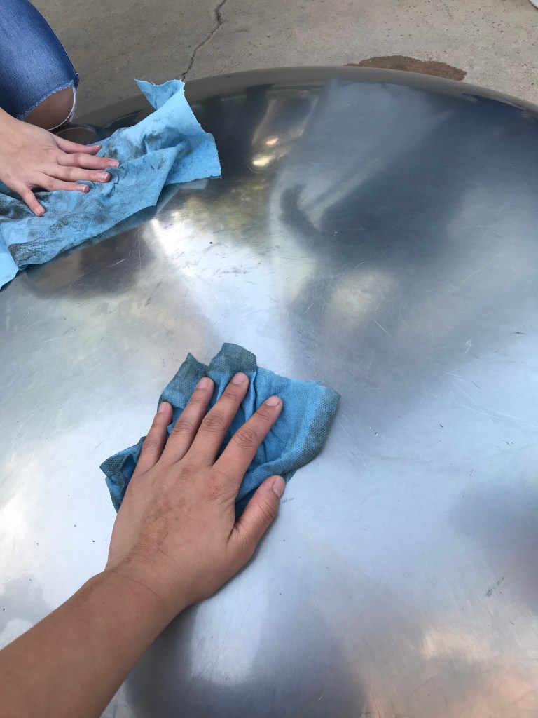 A: At first I didn’t know I was “performing.” I thought I was just cleaning up the NOW sculpture, but after discussing the definition of cleaning with the class, I understand that I was performing. I felt uncomfortable at first, because the public was looking at us weird for cleaning the sculpture, the more I performed, the more comfortable I go.